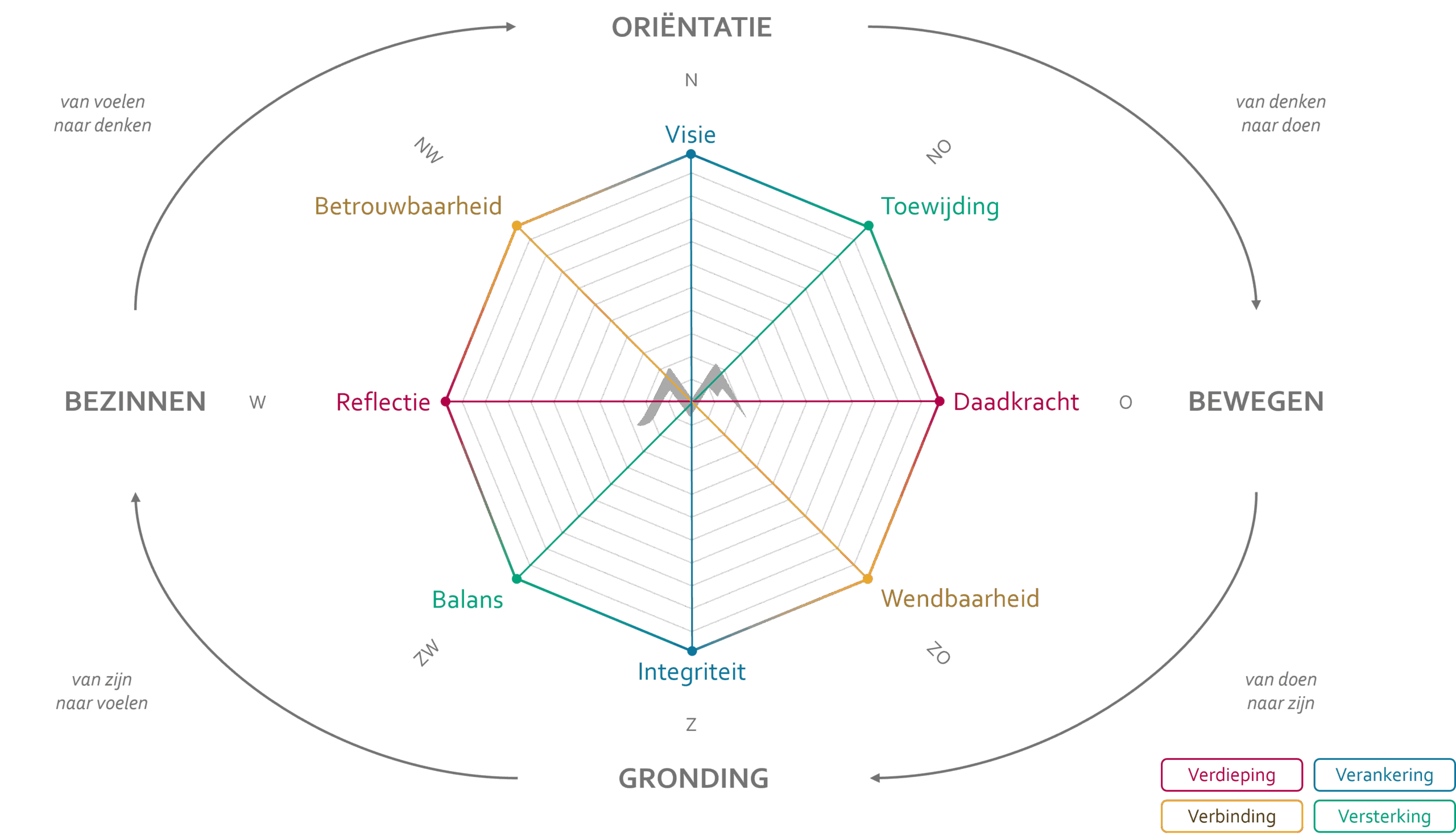 Het leiderschapskompas is geen meetinstrument of scorekaart. Het is ontwikkeld om te navigeren tussen de verschillende kwaliteiten en kwetsbaarheden van jouw leiderschap. Het kompas kent op elke windrichting een pijler: verdieping, verankering, versterking en verbinding.